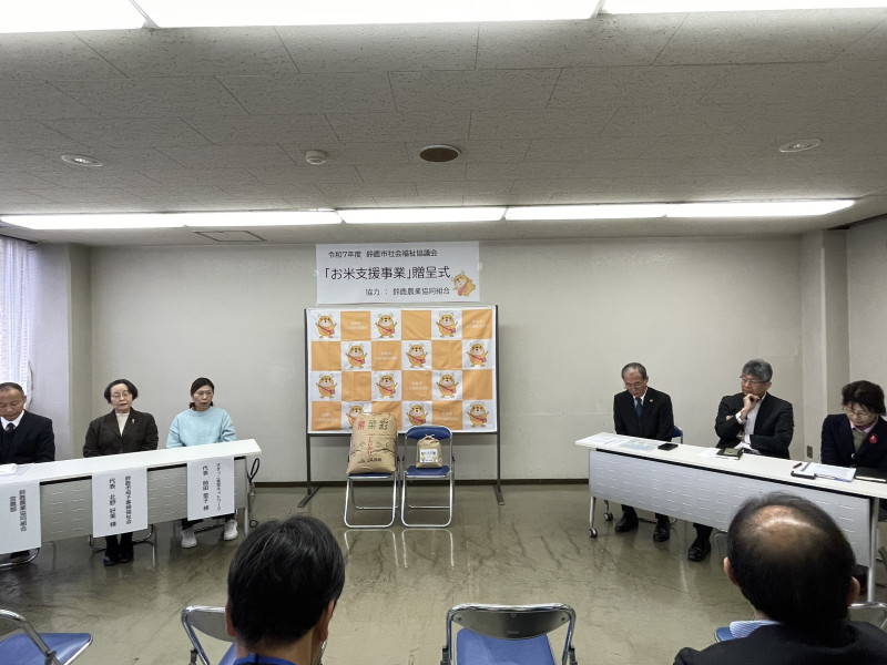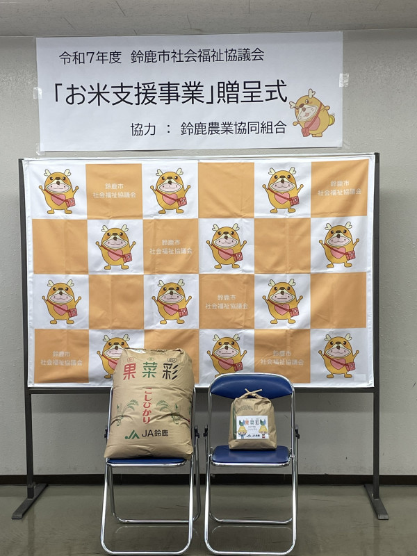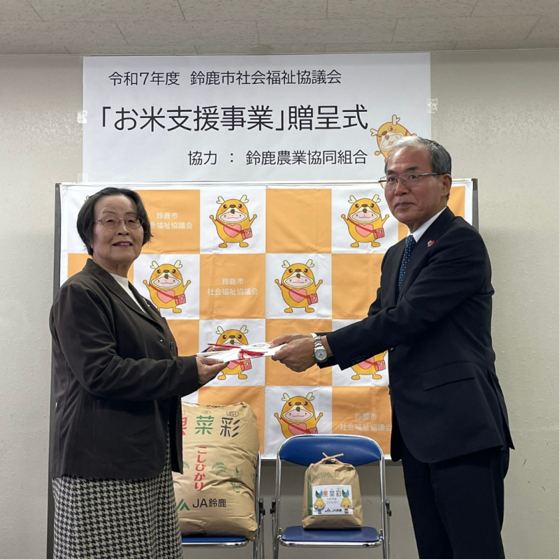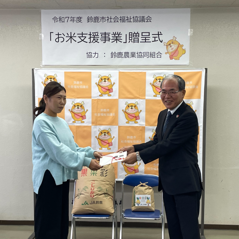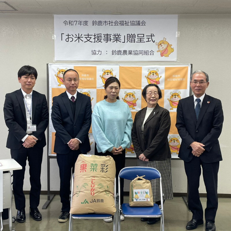 令和7年12月24日(水)、鈴鹿市社会福祉センターにて「お米支援事業」贈呈式を執り行いました。贈呈先及び内容は以下のとおりです。